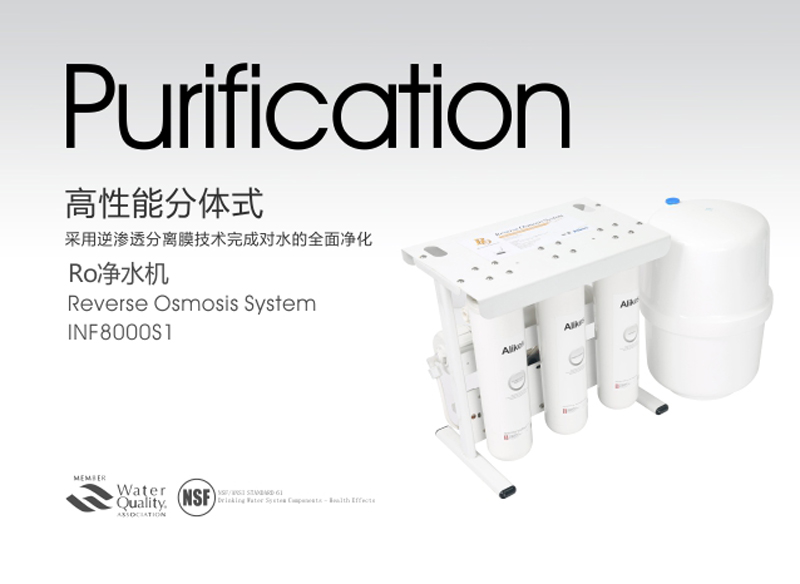 Alikes RO凈水機(jī)是對(duì)市政自來(lái)水或可以飲用的地下水進(jìn)行二次深度凈化處理的終端水處理設(shè)備,出水品質(zhì)符合衛(wèi)生部《生活飲用水水質(zhì)衛(wèi)生規(guī)范》(2001)的規(guī)定。凈水機(jī)應(yīng)用了******進(jìn)的逆滲透分離膜的技術(shù),依靠增壓泵對(duì)原水施加壓力,使原水透過(guò)逆滲透膜,把原水中細(xì)微雜質(zhì)、過(guò)多的無(wú)機(jī)鹽、有機(jī)物、重金屬離子、******、病毒、農(nóng)藥、三氯甲烷致癌物等有害物質(zhì)截留,并通過(guò)連續(xù)排放的濃水出口(污水排放口)將這些水中有害異物排出。進(jìn)而完成對(duì)水質(zhì)的******凈化。