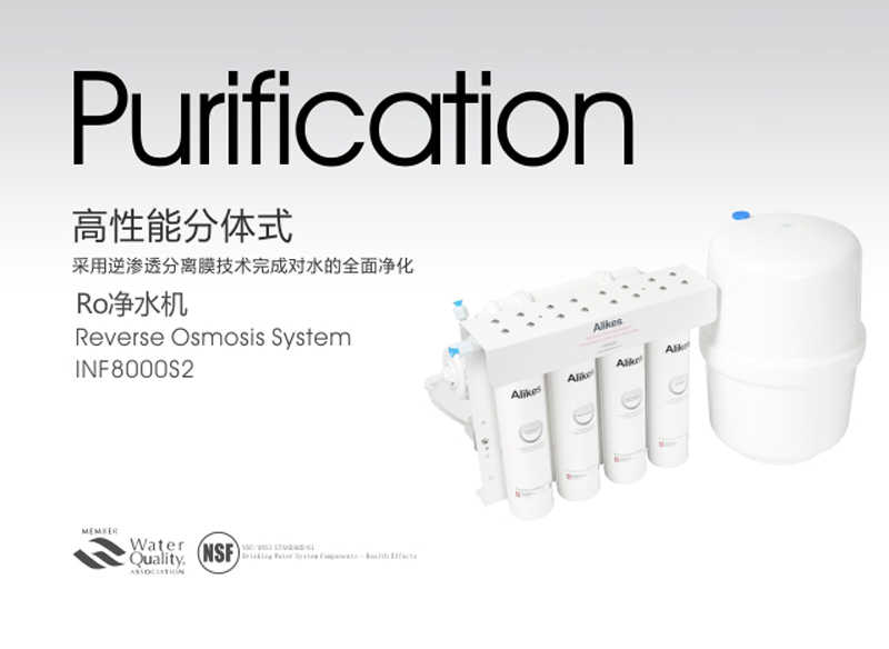 Alikes RO凈水機(jī)是對(duì)市政自來水或可以飲用的地下水進(jìn)行二次深度凈化處理的終端水處理設(shè)備,出水品質(zhì)符合衛(wèi)生部《生活飲用水水質(zhì)衛(wèi)生規(guī)范》(2001)的規(guī)定。凈水機(jī)應(yīng)用了******進(jìn)的逆滲透分離膜的技術(shù),依靠增壓泵對(duì)原水施加壓力,使原水透過逆滲透膜,把原水中細(xì)微雜質(zhì)、過多的無(wú)機(jī)鹽、有機(jī)物、重金屬離子、******、病毒、農(nóng)藥、三氯甲烷致癌物等有害物質(zhì)截留,并通過連續(xù)排放的濃水出口(污水排放口)將這些水中有害異物排出。進(jìn)而完成對(duì)水質(zhì)的******凈化。